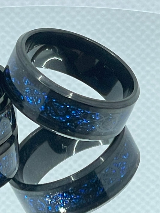 8mm Black Stainless Steel Ring Gold Dragon Detail on Glittery Blue Band