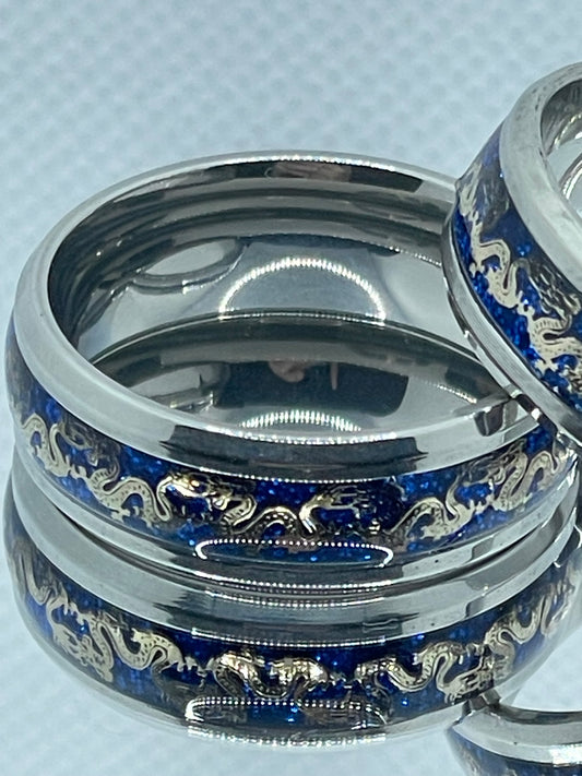 8mm Stainless Steel Ring Gold Dragon Detail on Glittery Blue Band
