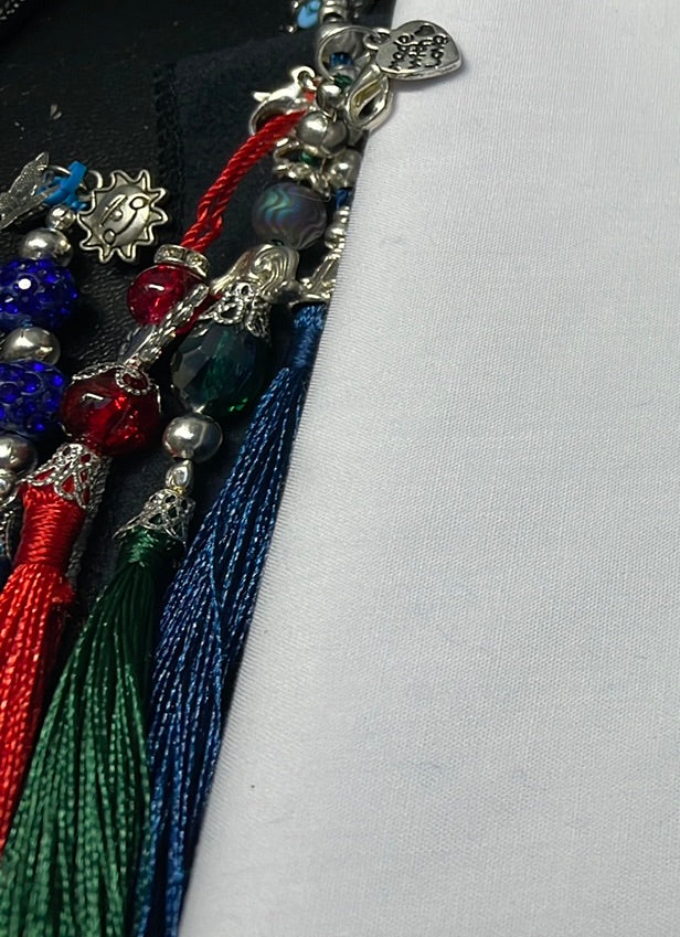 A shiny, silky feeling tassel completed with silver fittings including a 12mm lobster clasp. The 3 beads on the top area of the tassel are clay beads studded with rhinestones. The black bead has deep red rhinestones, the dark grey bead has rhinestones that look like marquisite, and the white bead is studded with clear rhinestones. All finished with a small heart charmvstating “Made with Love”.